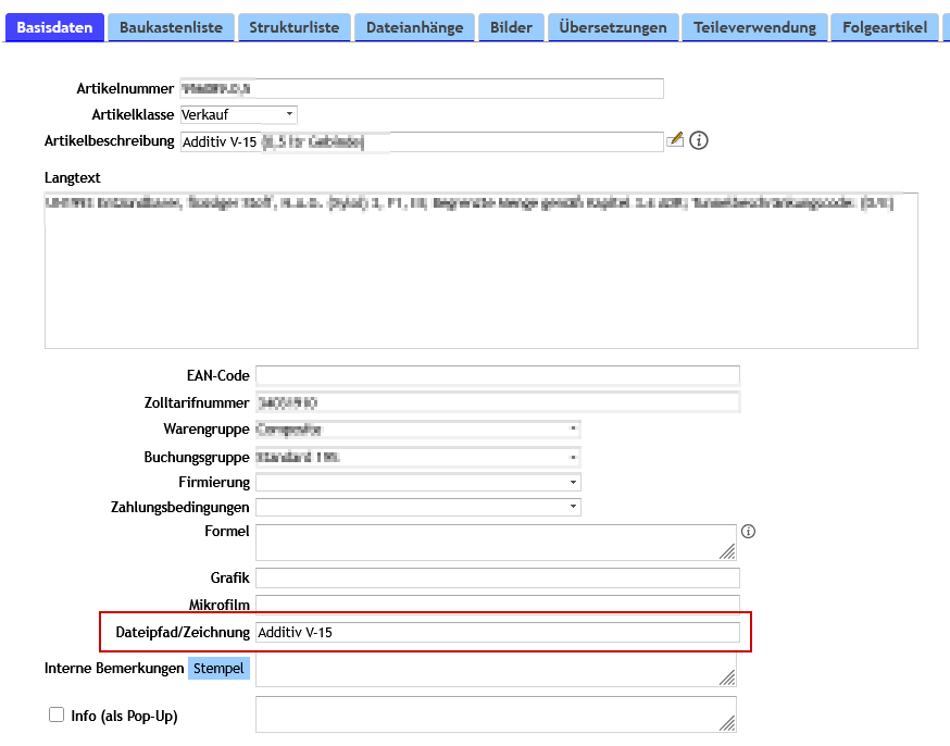 Die Zuweisung der Dateien zu den Artikeln geschieht über das Feld "Dateipfad/Zeichnung" in den Artikelstammdaten.